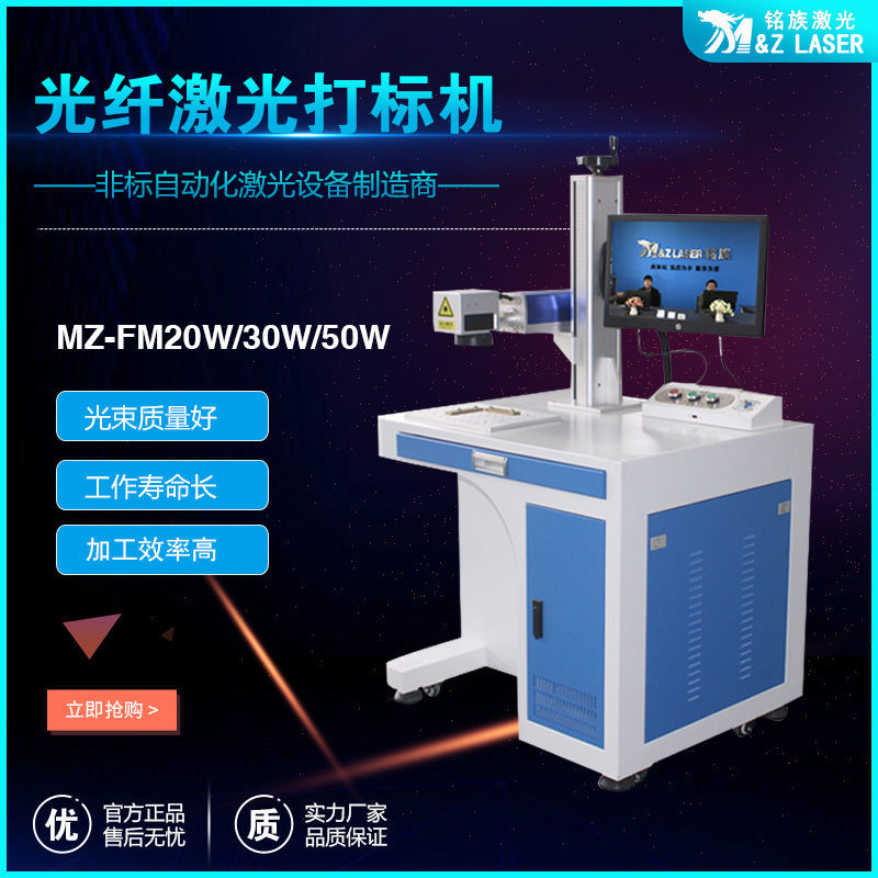 MZ-FM-20/30/50/100W-R光纖激光打標(biāo)機(jī)是我公司運(yùn)用現(xiàn)今世界上先進(jìn)的激光技術(shù)研制而成的新一代激光打標(biāo)機(jī)系統(tǒng)。采用武漢銳光纖輸出激光,再經(jīng)高速掃描振鏡系統(tǒng)實(shí)現(xiàn)打標(biāo)功能。光纖激光打標(biāo)機(jī)電光轉(zhuǎn)換效率高,達(dá)到30%以上,采用風(fēng)冷方式冷卻,整機(jī)體積小巧,輸出光束質(zhì)量好,可靠性高??傻窨探饘俨牧虾筒糠址墙饘俨牧?,主要應(yīng)用于對(duì)深度、光滑度、精細(xì)度要求較高的領(lǐng)域,如鐘表、首飾、模具行業(yè),位圖打標(biāo)等。